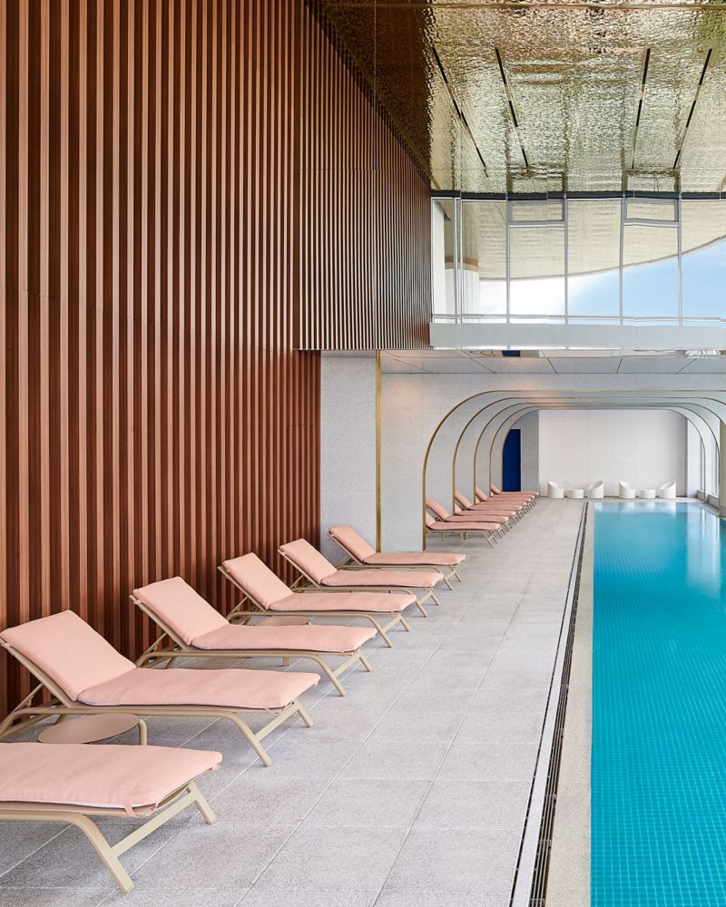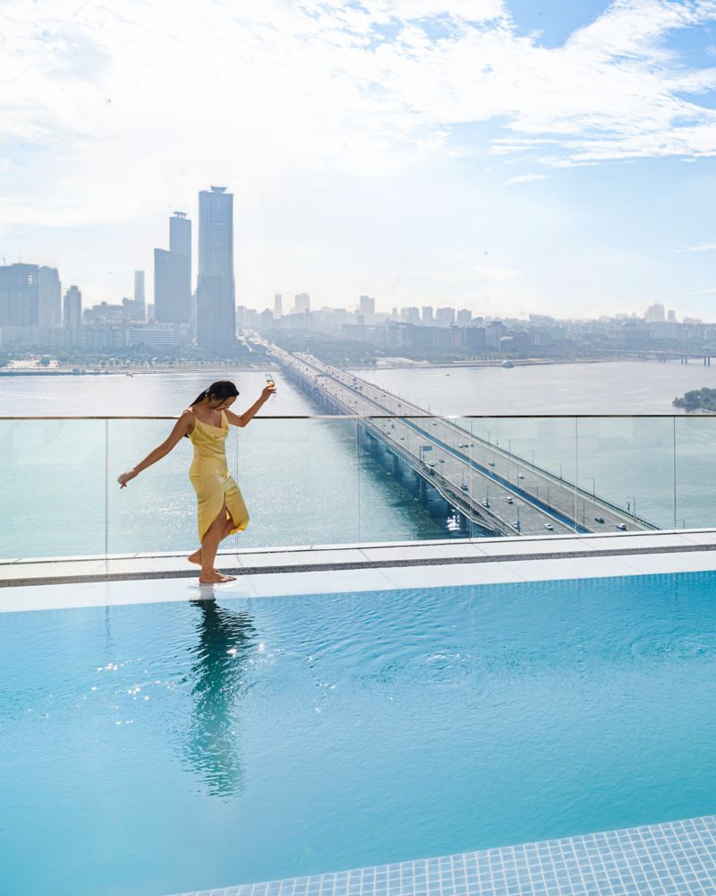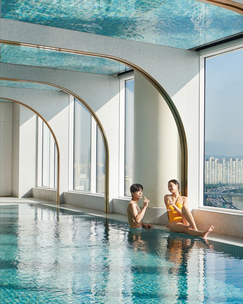 Infinity Pool and indoor pool offer a dramatic view of the Han River. A mix of translucent, clear materials in the pool area amplifies the light.
