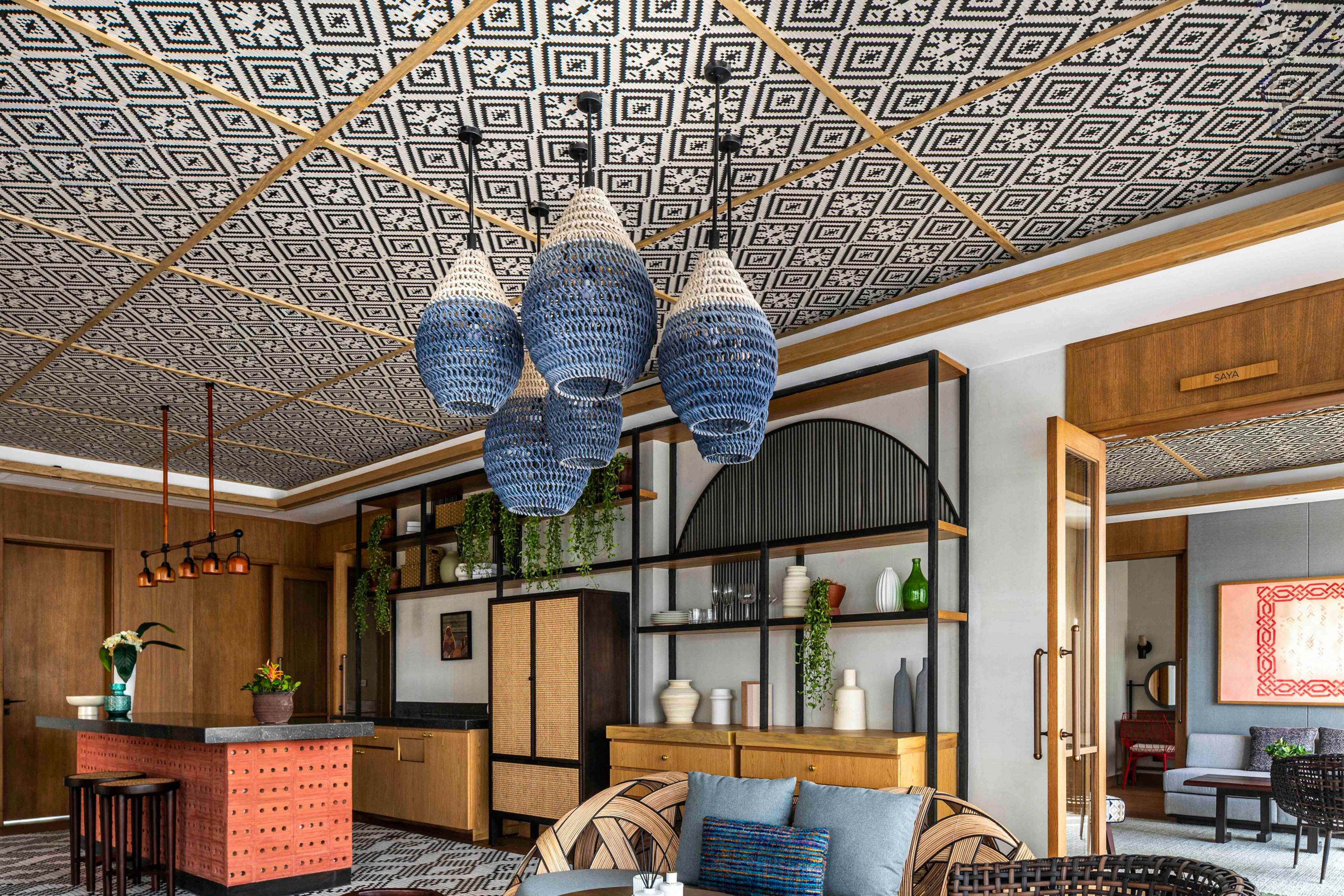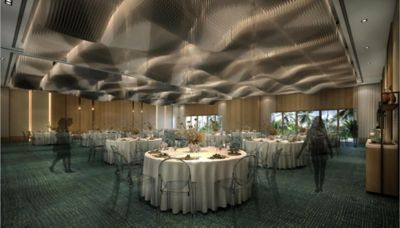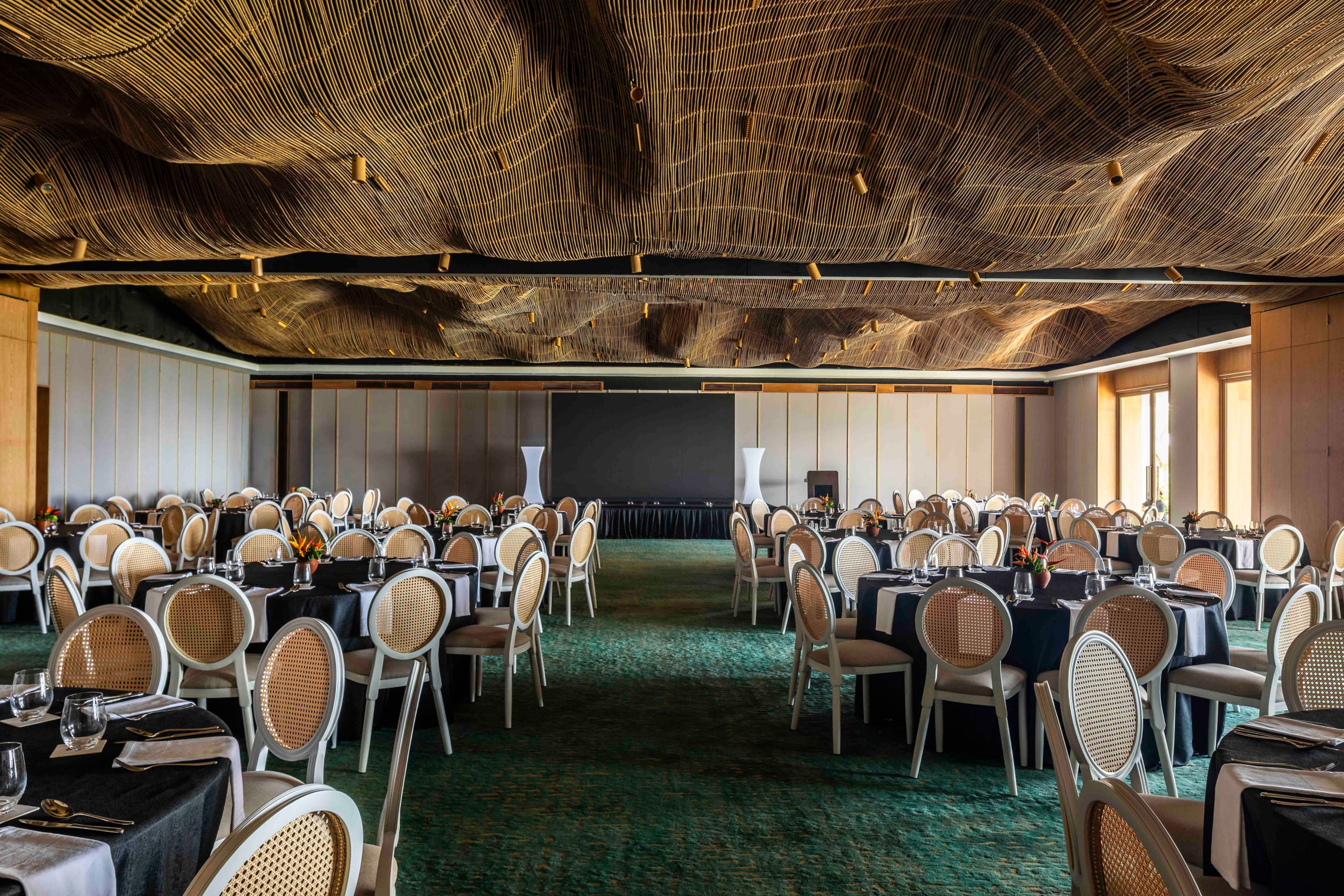 Our ceilings tell their own story. Natural rattan flows in sweeping patterns inspired by nature's own energy, creating texture and warmth throughout your celebration. These undulating forms ripple across the Marcela Ballroom, bringing warmth, tactility, and ecological conscience to the guest experience.