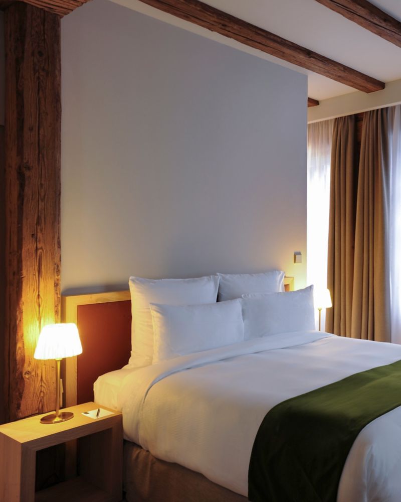 Disfrute de las comodidades modernas dentro de las murallas históricas. Los muebles de roble sólido, los acabados de terciopelo y las vistas de los viñedos alsacianos crean un refugio acogedor.