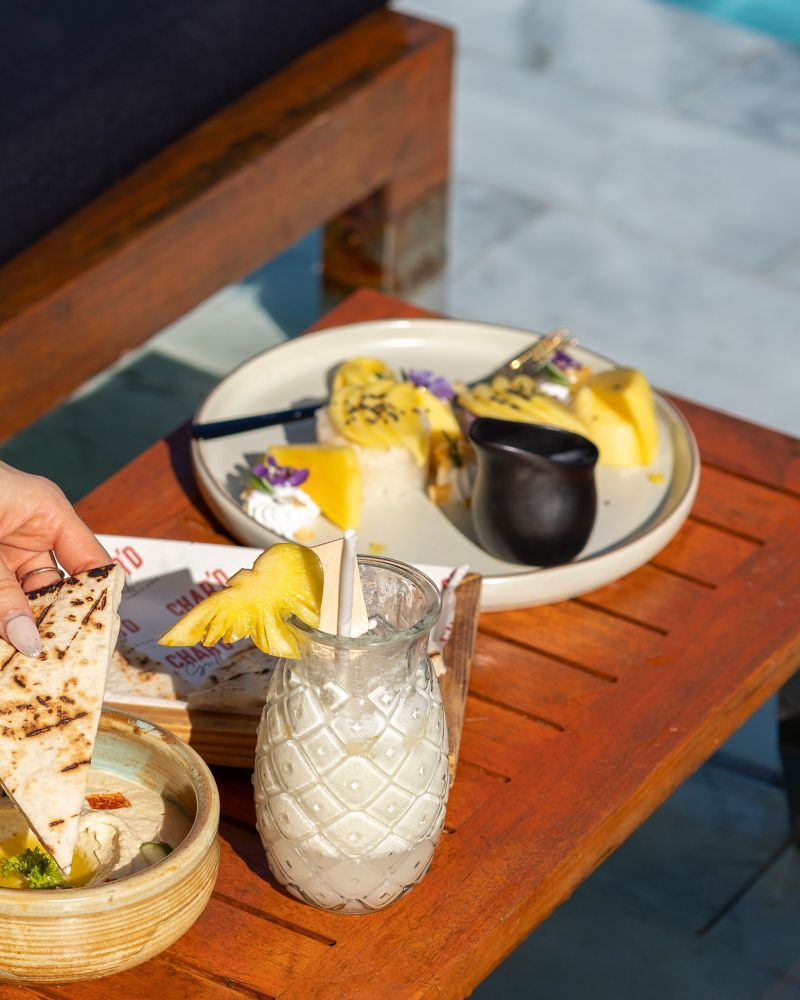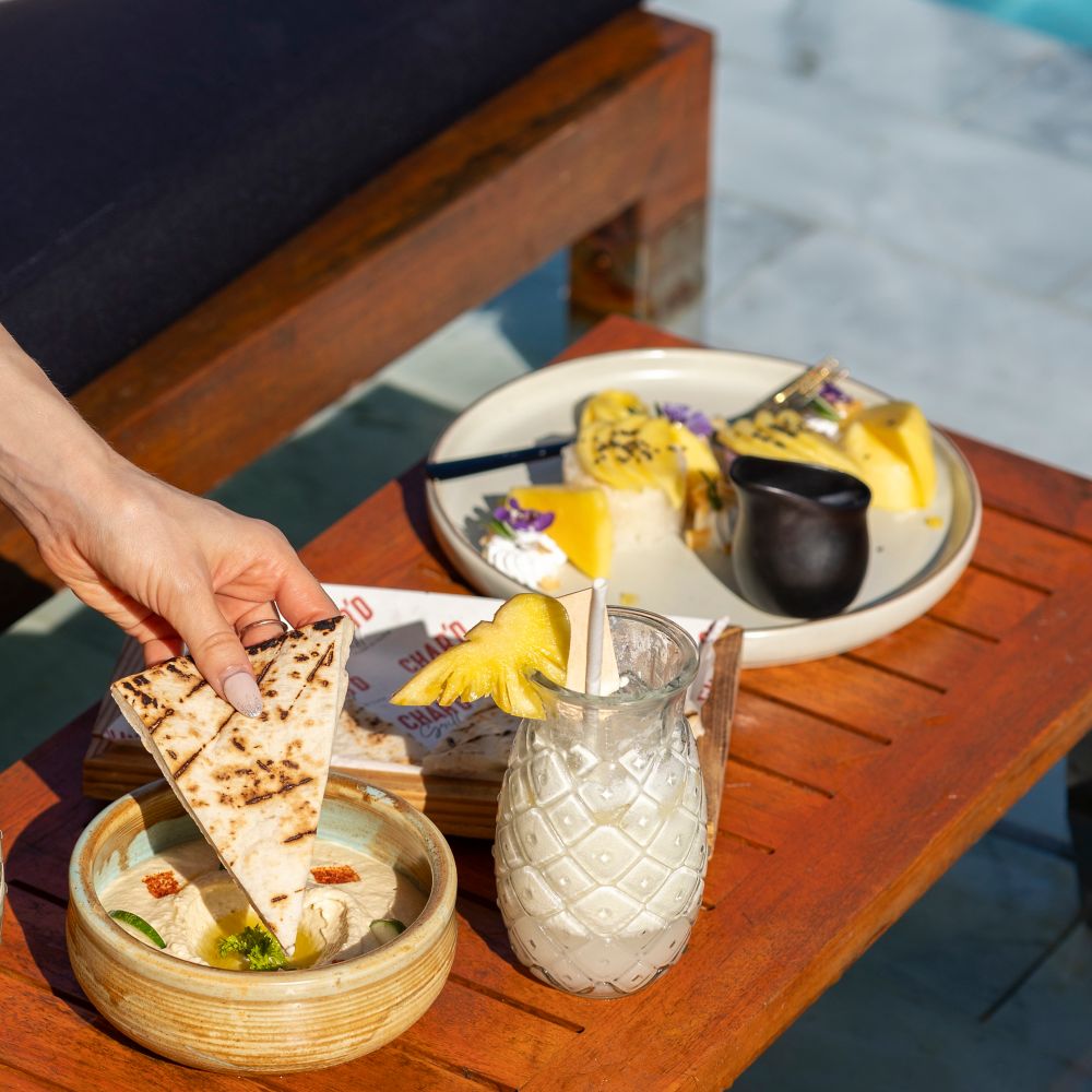 Desfrute de uma seleção diversificada de tapas com influências chinesas, tailandesas e portuguesas, uma jornada culinária à beira da piscina.