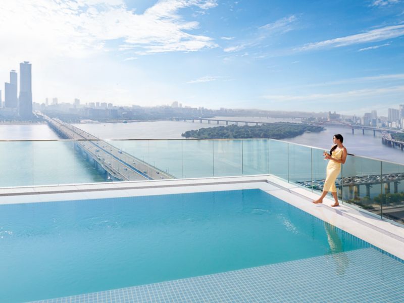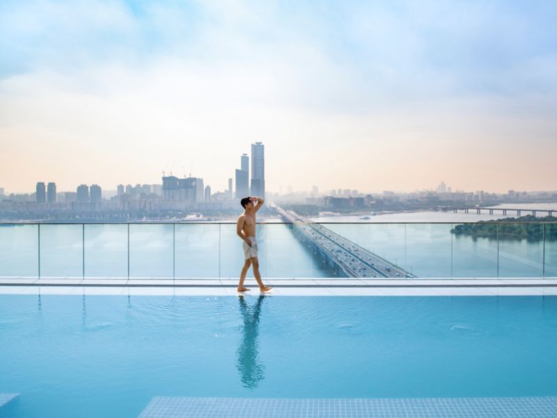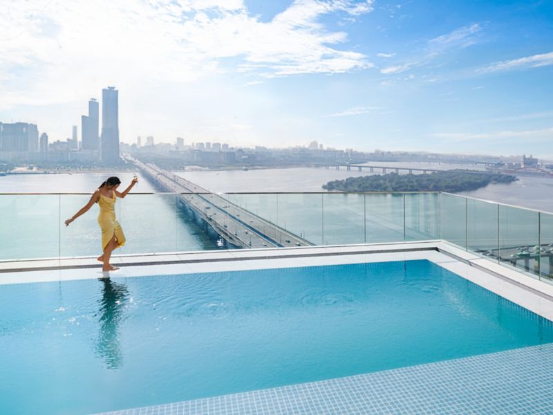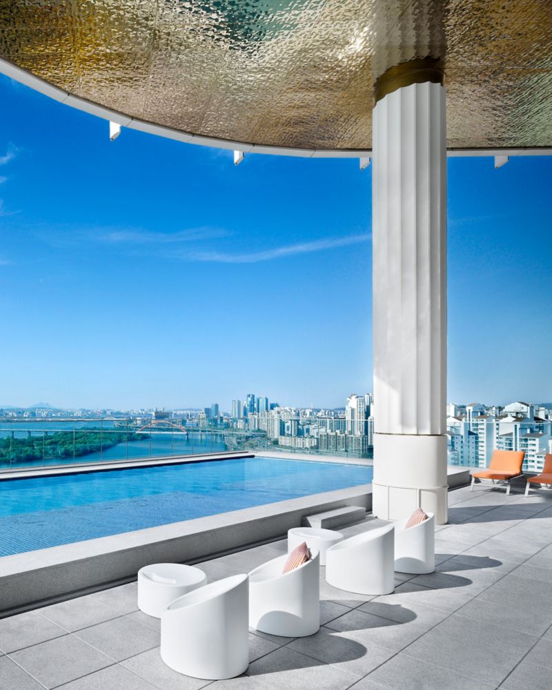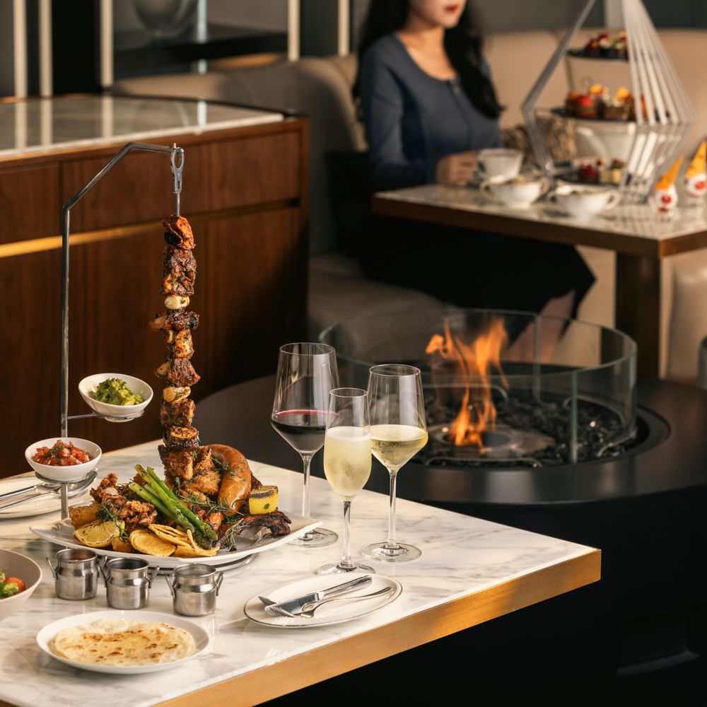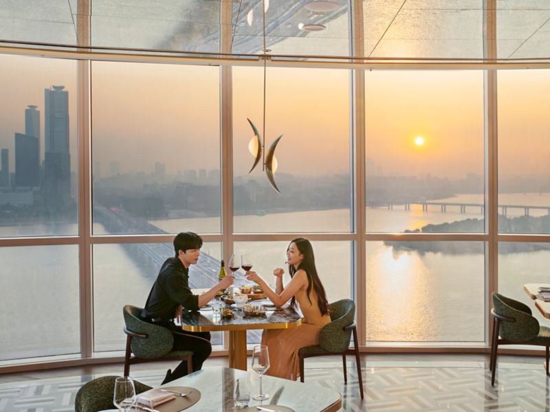Quando o céu de Seul brilha em tons de laranja, as delícias ao pôr do sol começam em nosso Lounge & Deck.
